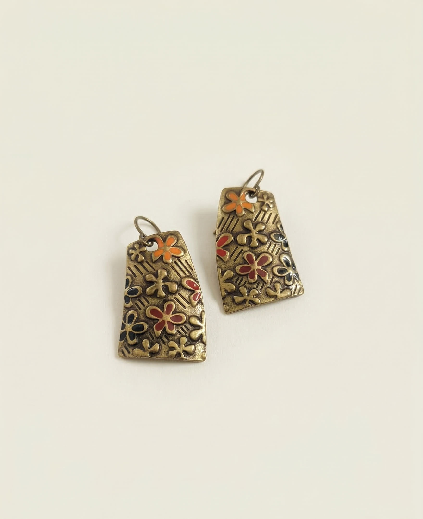 Bring a touch of boho artistry to your look with these gorgeous Antique Brass Floral Enamel Drop Earrings. Each earring features a bold trapezoid-shaped brass plate with a beautifully aged, antique finish that gives it a vintage, handcrafted feel.