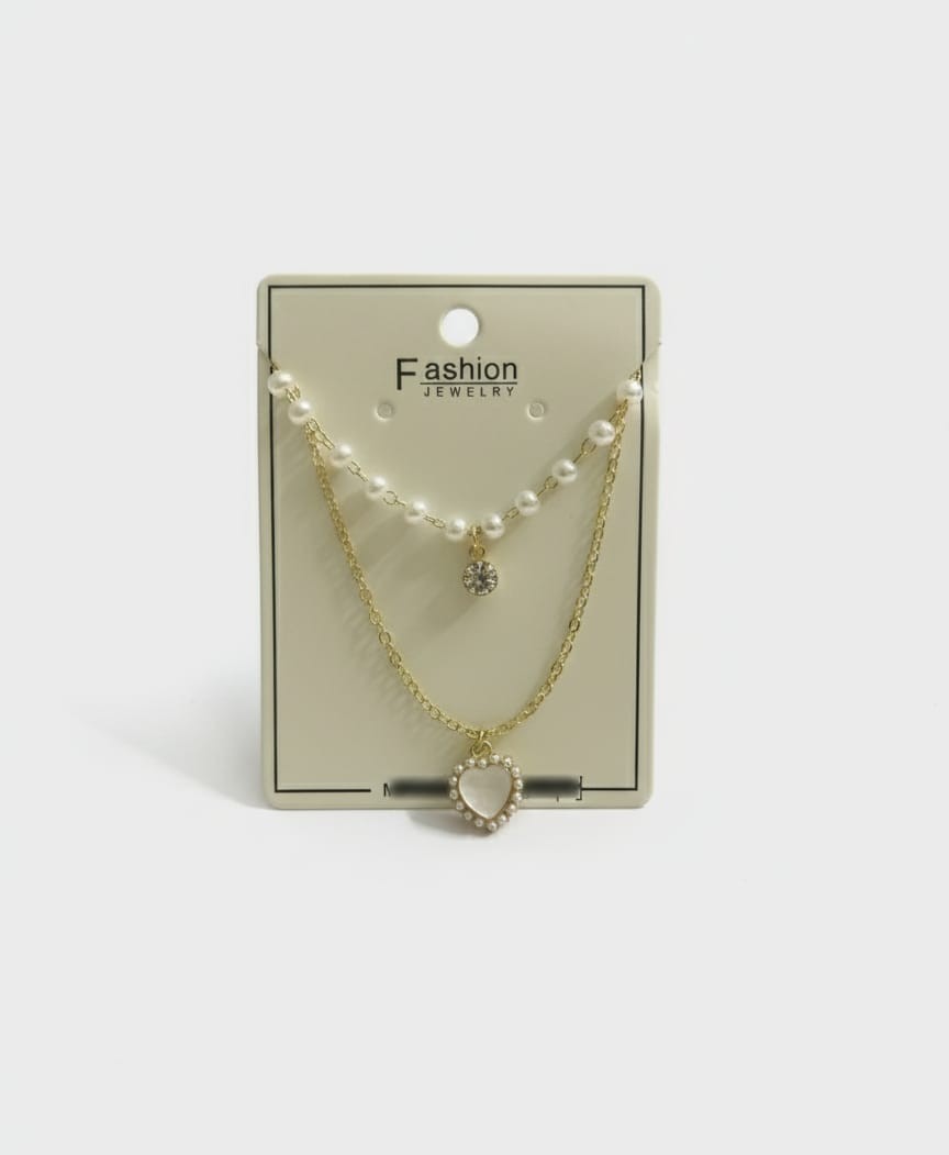 This charming layered necklace set includes two beautifully paired chains. The first is a faux pearl beaded chain with a sparkling crystal pendant, and the second is a gold-tone cable chain featuring a heart-shaped mother-of-pearl pendant rimmed with tiny pearls.